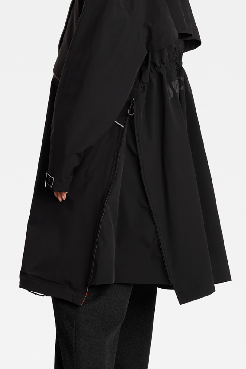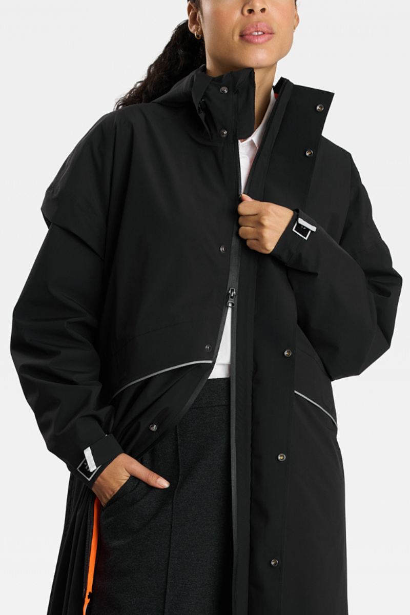 a drawstring to adjust the silhouette, large practical pockets , a zipped chest pocket , a double-opening front zip , and adjustable sleeves for tailored comfort.